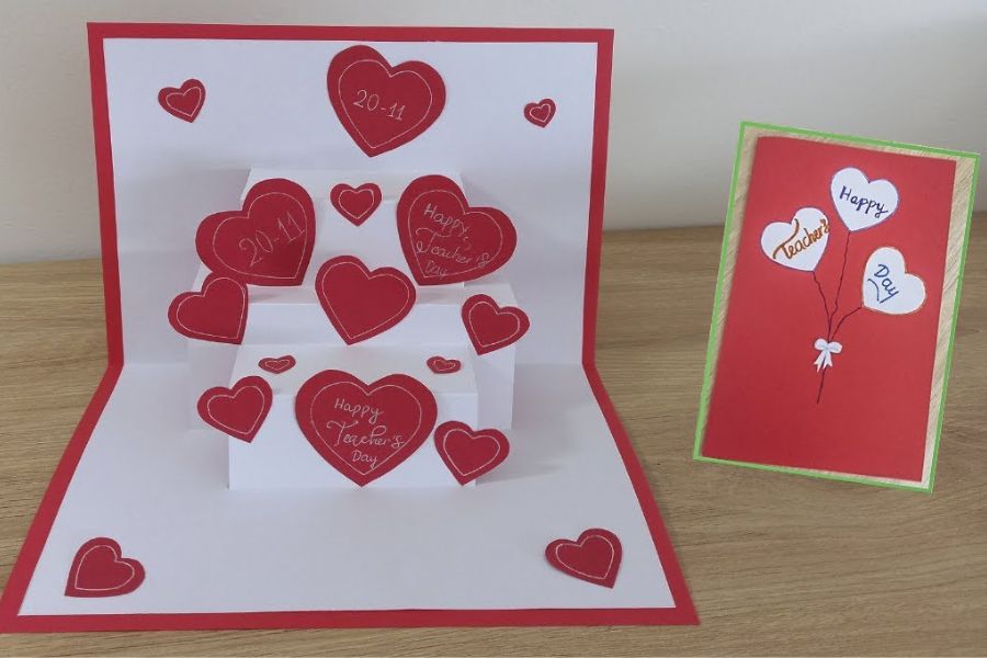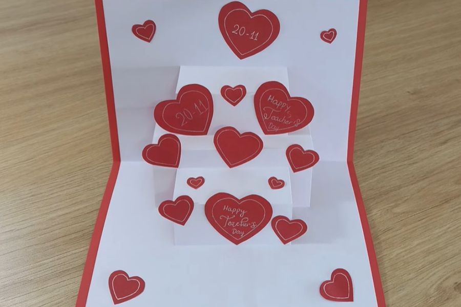 Thiệp trái tim xếp tầng thể hiện tình cảm chân thành, thích hợp tặng cô giáo hoặc thầy cô chủ nhiệm. Mẫu này dễ làm hơn thiệp hoa nhưng không kém phần ấn tượng.