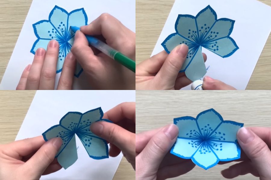Bước 9: Dùng bút dạ vẽ trang trí cho bông hoa như hình để thừa lại hai cánh không vẽ. Dùng kéo cắt một cánh thừa rồi dùng keo dán vào cánh còn lại. Làm theo các bước của hình minh họa sẽ được bông hoa như hình.