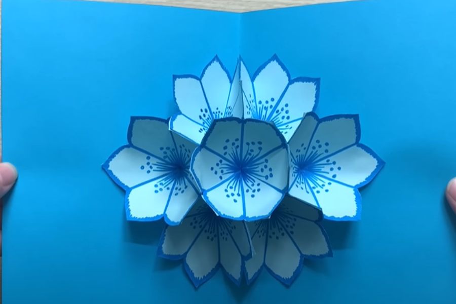 Thành phẩm: Sau khi dán xong mở thiệp ra sẽ có hình bông hoa 3d rất đẹp. Vậy là bạn đã hoàn thành xong thiệp 20 11 3d để tặng thầy cô giáo rồi đó!