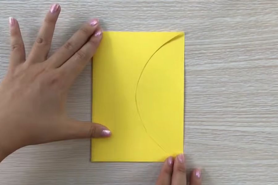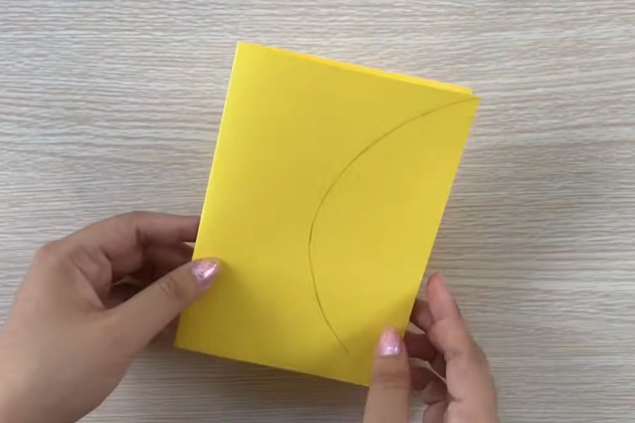 Bước 1: Gấp đôi bìa giấy a4, dùng comba tạo 1 đường cong lên trên bìa tấm thiệp.