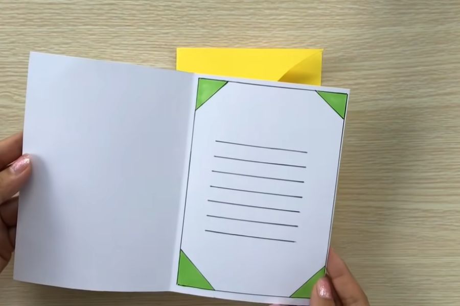 Bước 3: Chuẩn bị 1 bìa giấy trắng, có kích thước nhỏ hơn tấm thiệp màu vàng cả về chiều dài và chiều rộng. Trang trí 4 góc và kẻ dòng.