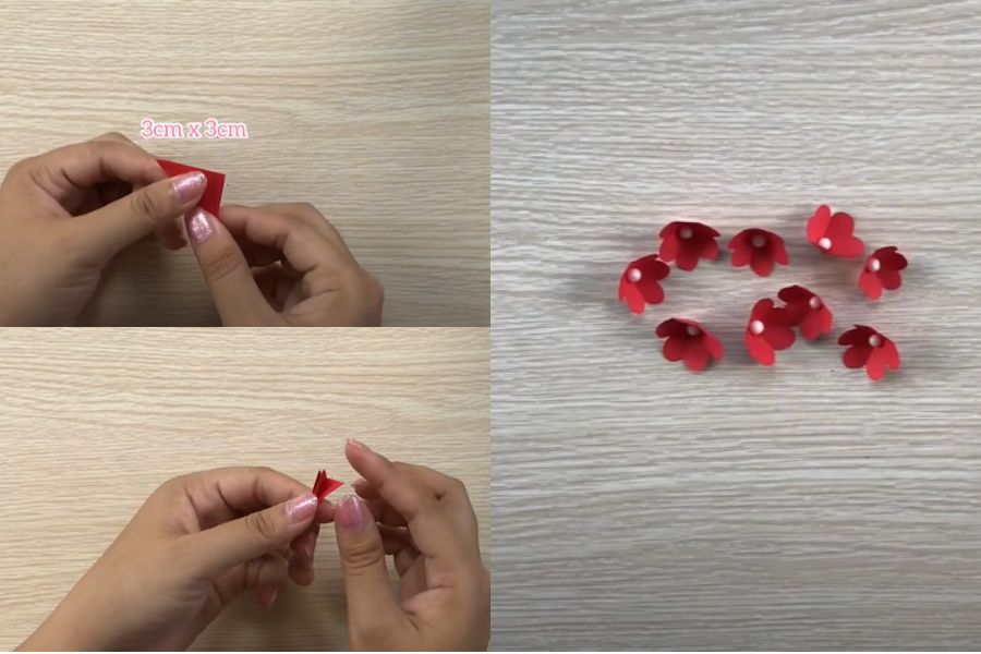 Bước 5: Chuẩn bị nhiều tờ giấy đỏ có kích thước vuông cạnh 3cm. Gấp đôi tờ giấy theo hình tam giác 2 lần. Gấp 2 cạnh của tam giác lên phía trên. Dùng bút chì phác họa 1 đường cong, dùng kéo cắt theo đường cong đó bạn sẽ thu được hình hoa 6 cánh.