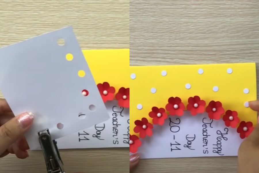 Bước 7: Dùng ghim bấm để tạo họa tiết hình tròn. Dùng keo để dán hình tròn lên mặt trước tấm thiệp 20/11 để trang trí. Vậy là bạn đã hoàn thành tấm thiệp bằng giấy a4 đơn giản mà cực đẹp rồi đó!