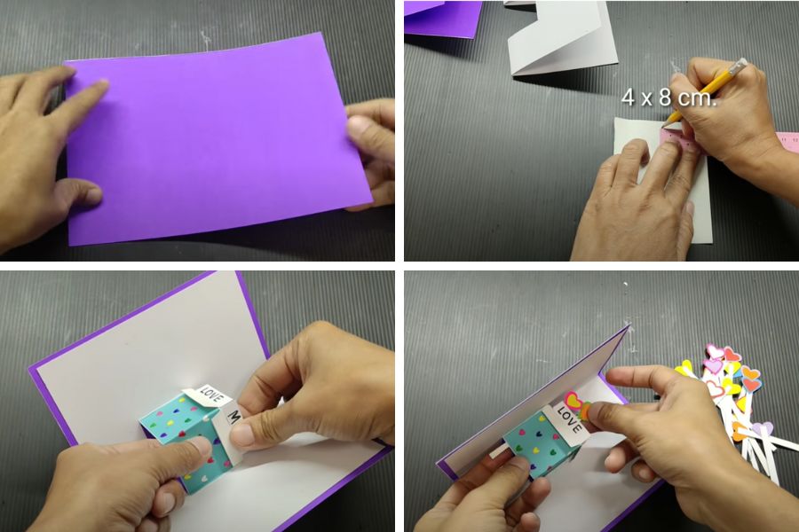 - Bước 3: Để tờ giấy vừa làm trên vào mặt trong của tờ A4 màu tím và dùng keo dán chúng lại với nhau. Dùng tờ giấy dài gấp thành 5 phần có kích thước 4×1 cm và dùng keo dán lại thành hình hộp vuông. Làm mẫu hashtag mini có chữ Love, Mom và dán vào bên trong hộp quà.