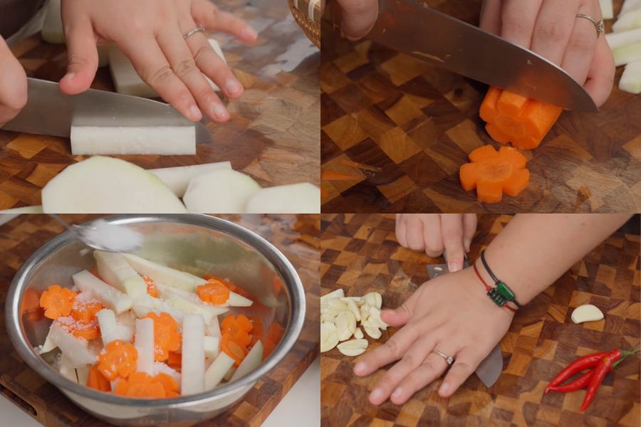 - Cà rốt tỉa hình hoa hoặc thái theo tùy ý thích để trông đẹp mắt hơn (thái mỏng hơn su hào một chút vì cà rốt có độ cứng và lâu thấm vị hơn).