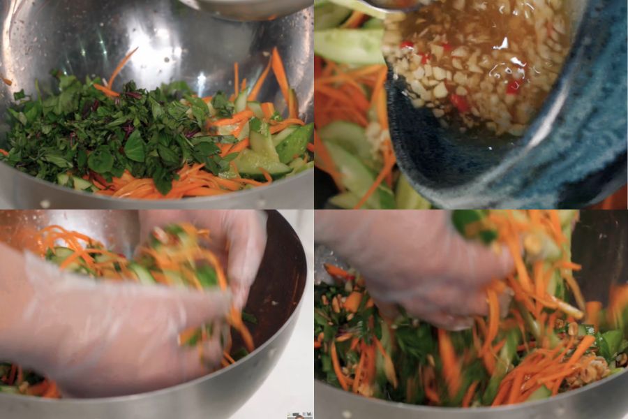 - Tiếp theo cho gần hết rau thơm, tỏi, ớt băm, đậu phộng rang, đổ nốt phần hỗn hợp nước mắm còn lại vào rồi trộn đều.