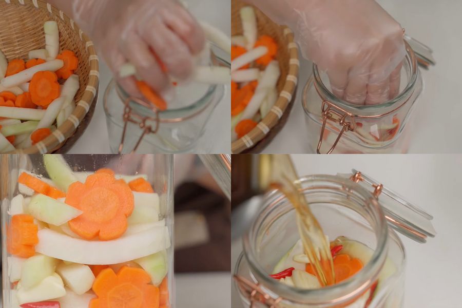 - Cho su hào, cà rốt vào lọ rồi một lớp tỏi, ớt rồi làm đến khi hết.