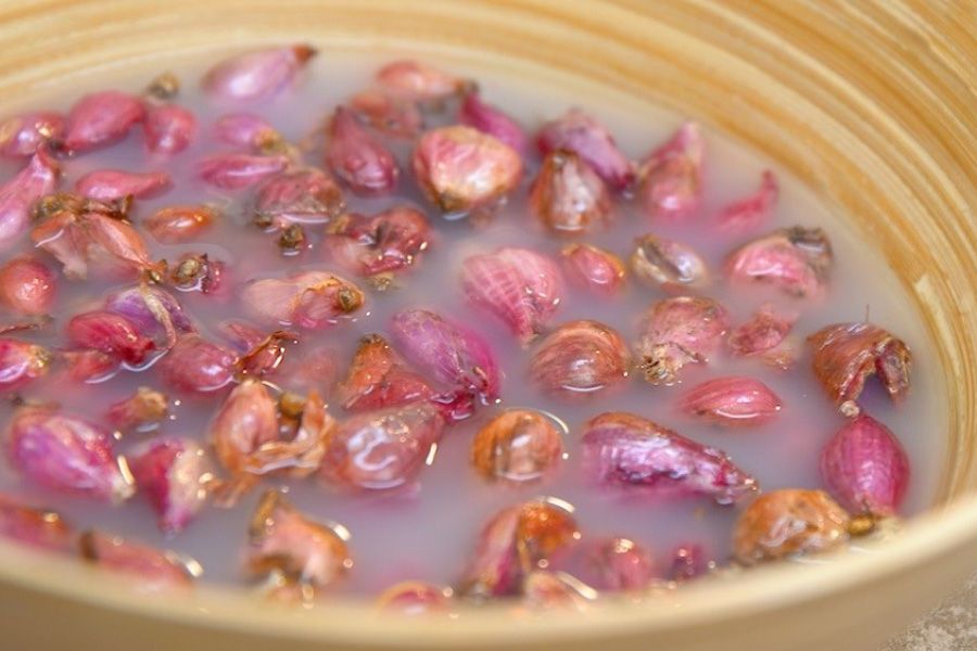 Trước khi muối, bạn có thể ngâm hành trong nước muối loãng hoặc nước vo gạo khoảng 8-12 tiếng. Cách này giúp hành bớt cay và làm mềm vỏ, dễ bóc hơn.
