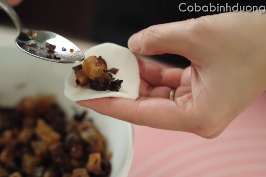 • Vo tròn bột rồi ấn dẹp bột sau đó cho phần nhân thịt heo quay vào rồi bọc phần nhân lại.