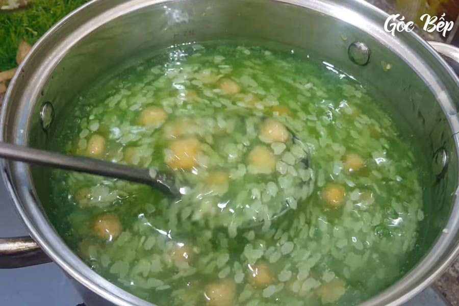 - Khi nước cốt dừa sôi thì bạn cho bột năng vào và khuấy đều tay. Khi nước cốt dừa sôi trở lại và đặc sánh thì bạn tắt bếp.