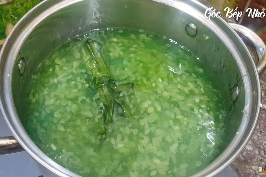 - Bạn rửa sạch 200g cốm khô (cốm tươi thì không cần rửa) sau đó cho cốm vào và nồi nước đường khuấy đều tay khoảng 3 phút cho cốm chín. Bạn có thể cho vài giọt hương lá dứa vào để cho chè có màu đẹp và thơm hơn.