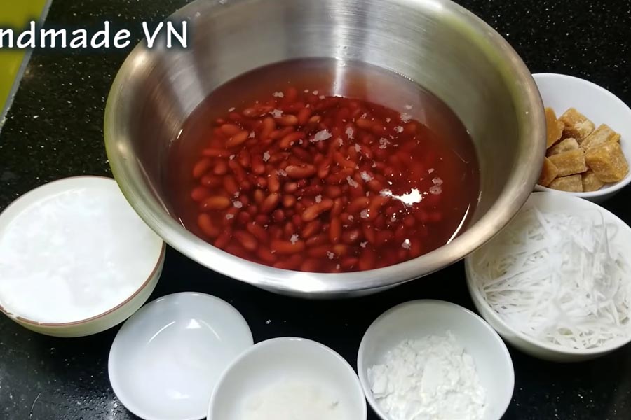 - Đầu tiên, ngâm đậu đỏ trong nước qua đêm và lựa chọn những hạt đậu đỏ tươi mới, rồi cho thêm chút muối vào để tăng độ mềm.