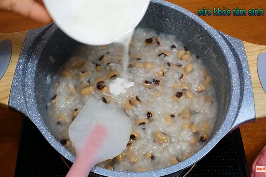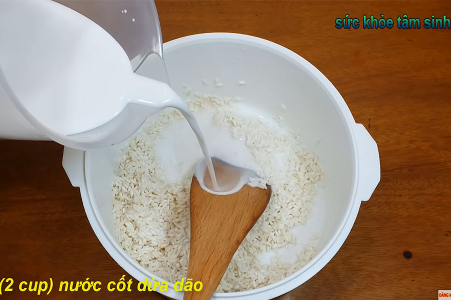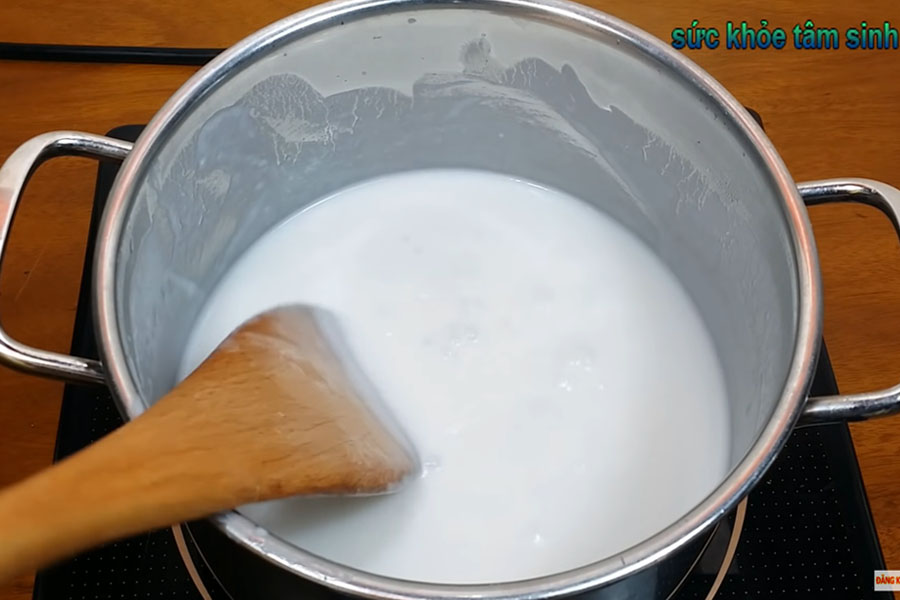 - Cho 300ml nước cốt nhất, 100ml nước lọc,20g đường phèn và ¼ thìa cà phê muối. Sau đó cho hỗn hợp bột gạo và bột năng vào trong nồi. Đun với lửa nhỏ và khuấy đều tay đến khi nước cốt dừa sánh lại thì tắt bếp.