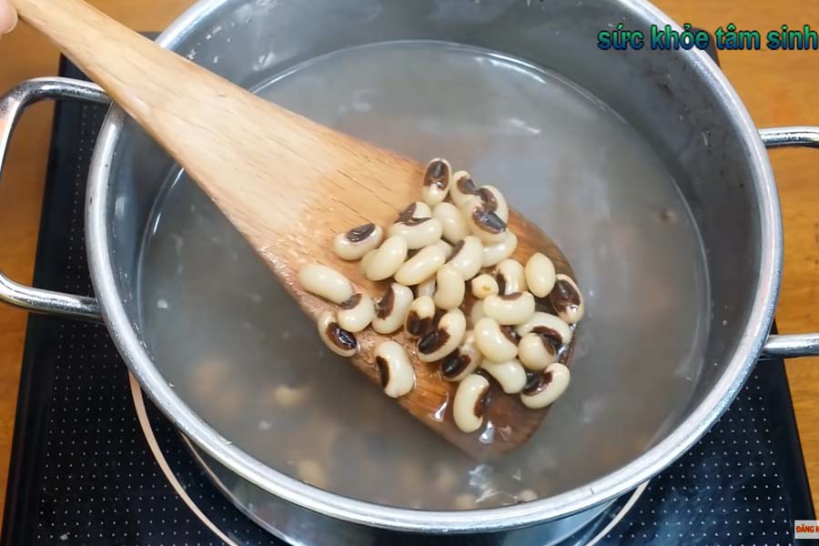 - Đậu trắng sau khi ngâm xong bạn rửa sạch lại với nước. Sau đó cho 1 lít nước, ½ thìa cà phê muối và đậu trắng vào nồi luộc. Luộc đậu khoảng 45 phút với mức lửa nhỏ.