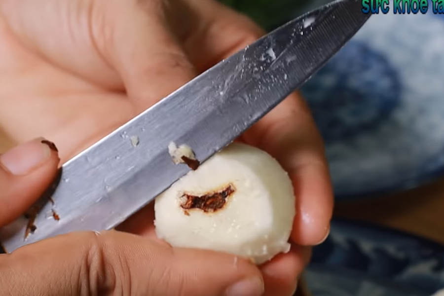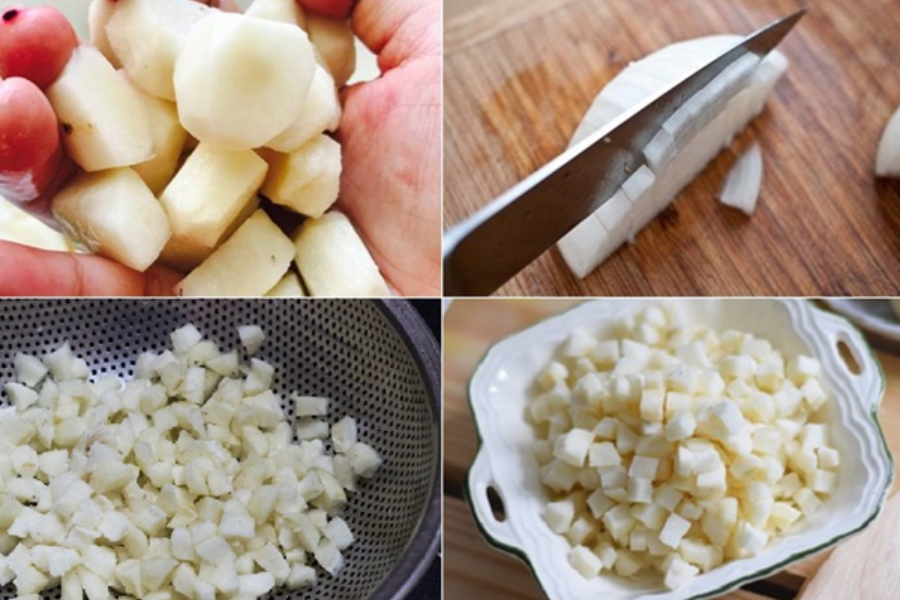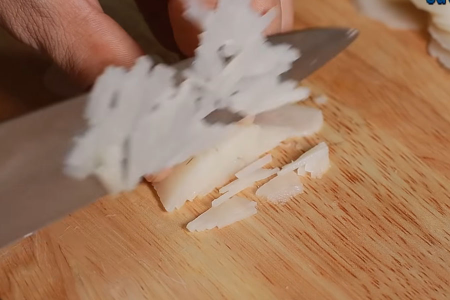 - Bạn vớt củ năng ra. Dùng dao cắt thành các sợi mỏng nhuyễn.