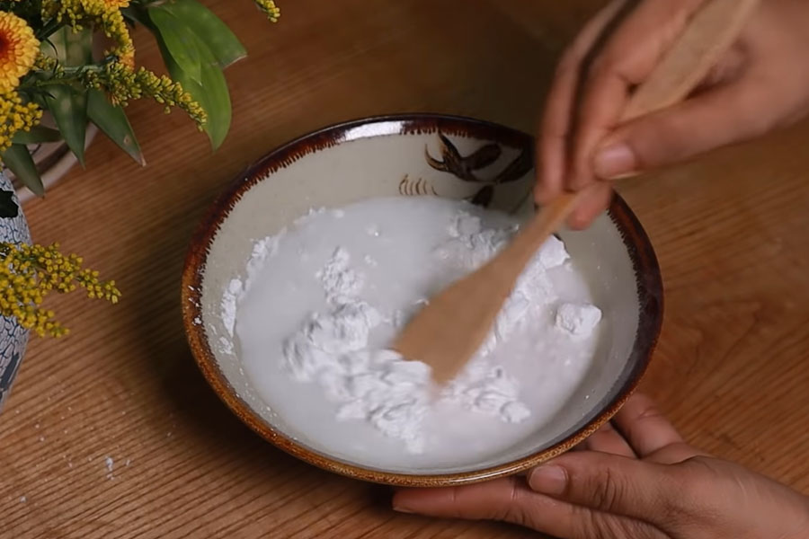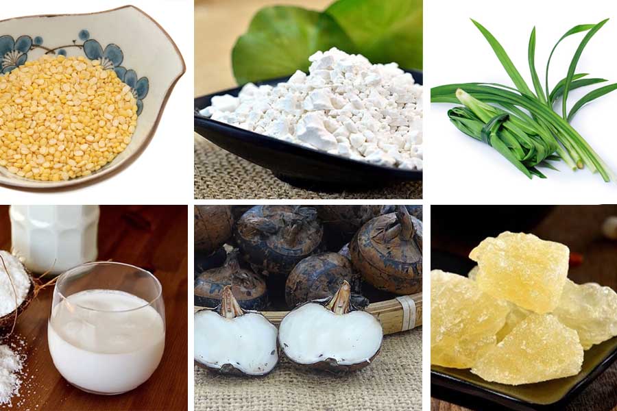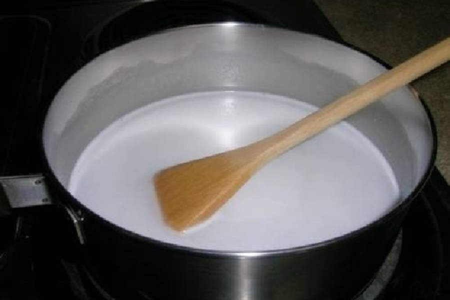 - Cho 5g bột gạo, 10g bột năng, 20g đường trắng, ½ thìa cà phê muối, 125ml nước và 400ml cốt dừa. Đun với lửa nhỏ và khuấy đều tay đến khi nước cốt sánh đặc lại thì bạn tắt bếp.