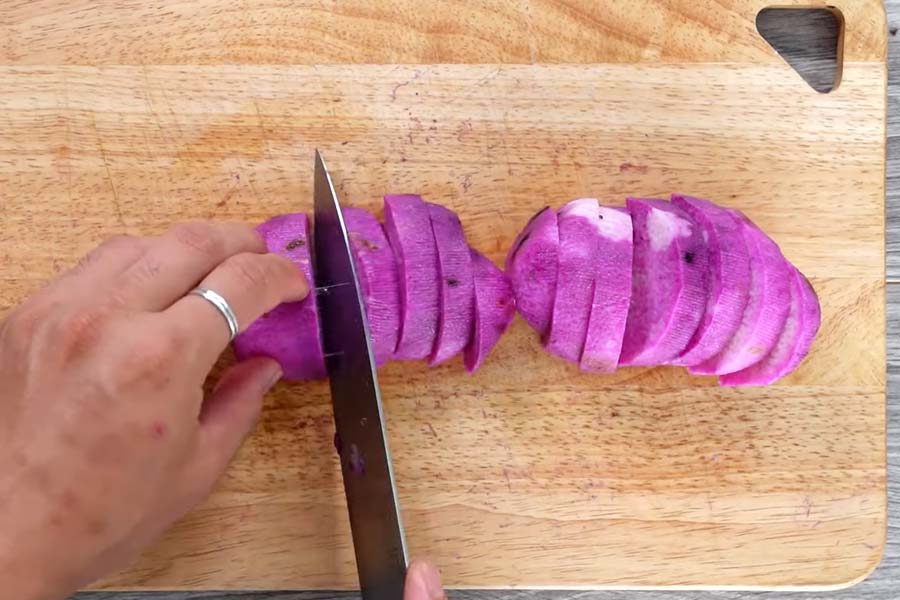 - Khoai mỡ bạn cắt vỏ sạch sau đó cắt thành các khúc nhỏ.