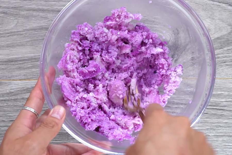 - Cho 50g bột năng vào trộn đều với khoai mỡ. Bạn nhồi bột đến khi bột mịn rồi vo bột thành các viên nhỏ tròn.