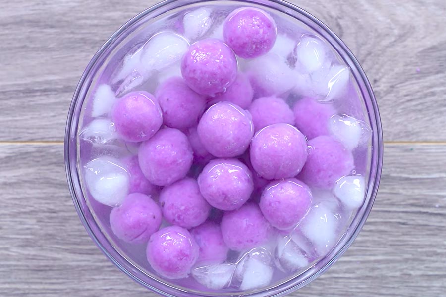 - Luộc cho đến khi các viên bột chín nổi lên trên mặt nước thì bạn vớt ra cho vào một tô nước đá ngâm khoảng 5 phút.