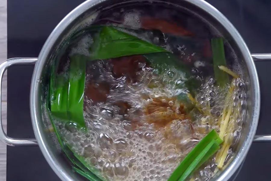 - Cho 500ml nước vào nồi mới. Sau đó cho thêm 5g gừng sợi, 5g lá dứa và 100g đường thốt nốt vào nồi.