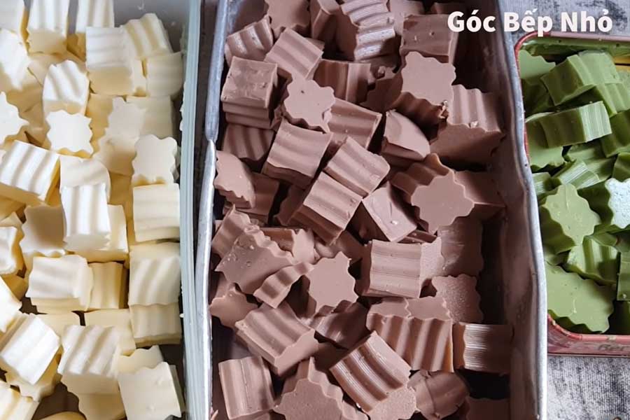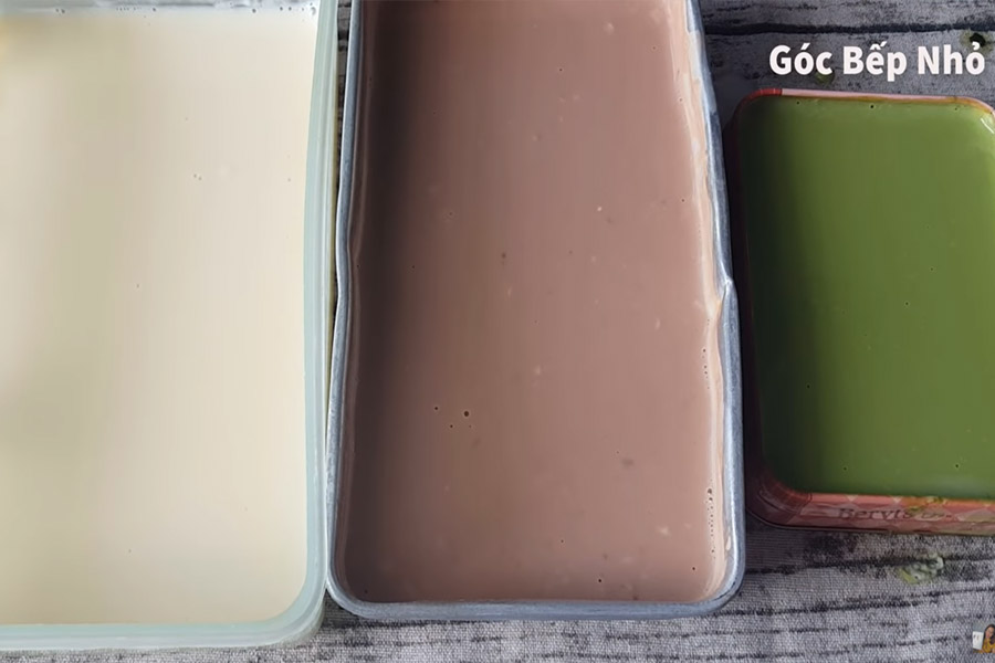 - Cho bột ca cao vào 1 khay làm thạch màu đà. Cho bột trà xanh vào một khay khác để làm thạch màu xanh. Còn một khay để nguyên để làm thạch màu trắng.