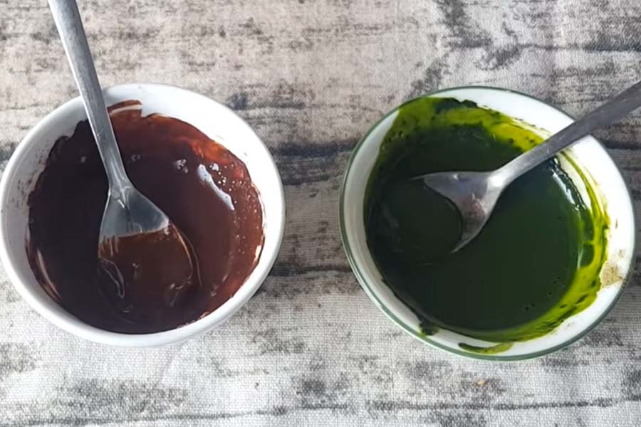 - Hòa tan bột ca cao và bột trà xanh với 20ml nước.