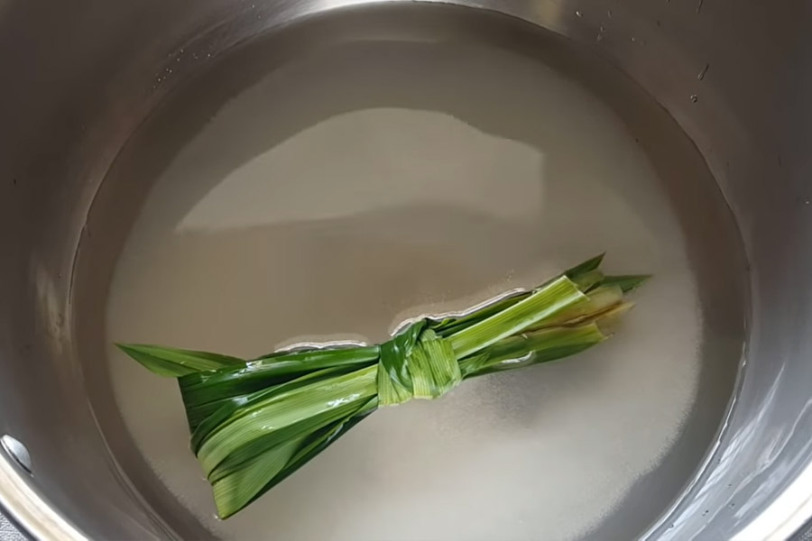 - Cho 200g đường, 600ml nước và 3 chiếc lá dừa vào nồi. Đun đến khi đường sôi lên và tan hết ra thì bạn tắt bếp để nguội.