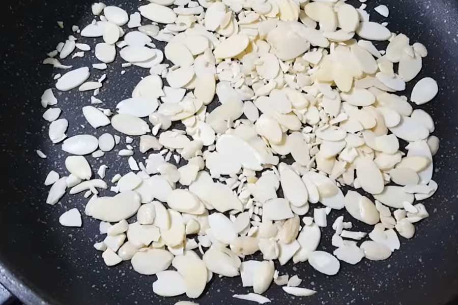 - Cho 50g lên chảo. Rang đều tay với lửa nhỏ đến khi hạnh nhân chín vàng thì bạn tắt bếp.