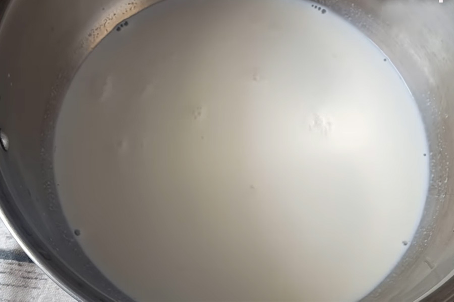 - Cho 700ml sữa tươi, 5g bột rau câu dẻo vào nồi. Khuấy đều tay cho phần bột rau câu tan hoàn toàn. Ngâm khoảng 5-10 phút.