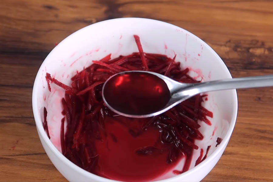- Củ dền gọt vỏ sau đó bào thành các sợi nhỏ. Cho cho 1 ít nước vào để lấy phần nước màu của củ dền.