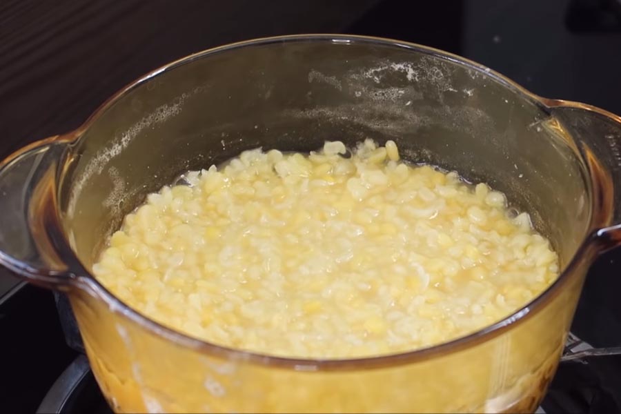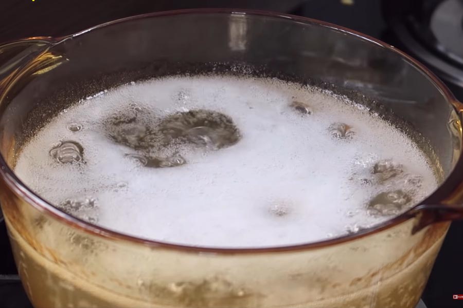 - Cho 2 lít nước vào nồi. Đun đến khi nước sôi thì bạn cho phần hạt lựu vào luộc.