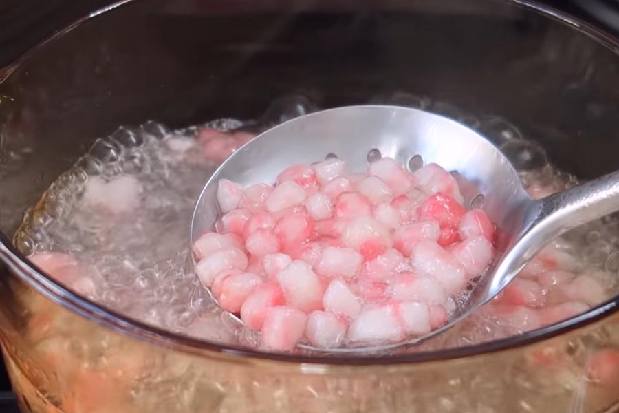 - Đun và khuấy đều tay khoảng 3-5 phút đến khi hạt lựu chín trong thì bạn vớt ra ngâm vào trong nước lạnh.