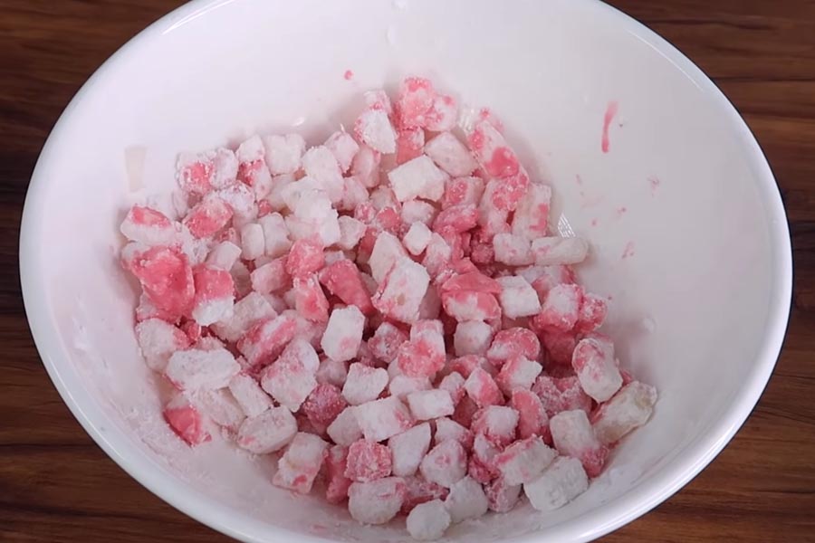 - Lê cắt thành các hạt lựu nhỏ rồi trộn đều với 100g bột năng và phần nước màu củ dền.