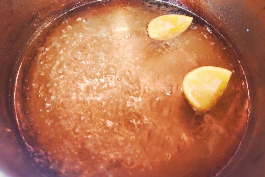 - Bước 1: Sau khi đã vớt hết bọt và tép chanh ra ngoài, bạn cho phần vỏ chanh đã vắt lúc đầu vào nồi và đun với mức lửa nhỏ. Vỏ chanh có tác dụng chuyển hóa đường saccarozơ thành glucozo nhanh hơn tạo mùi thơm và tăng thời hạn bảo quản nước đường.