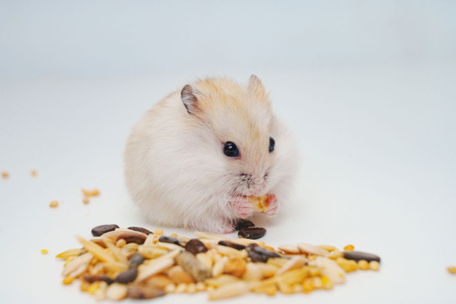 Là loài động vật gặm nhấm, chế độ ăn chủ yếu của chuột Hamster là các loại hạt ngũ cốc giàu dinh dưỡng như hạt dẻ, hạt bí, hạt hướng dương,… Mỗi ngày, bạn cần cho Hamster ăn khoảng 2 bữa gồm sáng và tối trong thời gian cố định ví dụ là 8 giờ sáng và 8 giờ tối. Bạn nên tạo thói quen ăn uống như vậy và tránh việc thay đổi trong suốt quá trình nuôi bé Hamster.