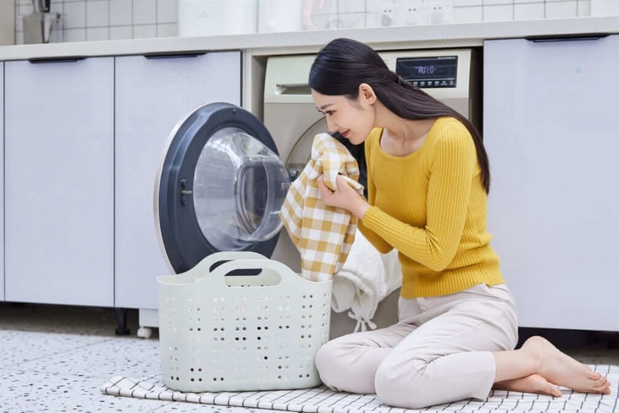Sau khi phân loại quần áo thành từng giỏ riêng biệt, dùng một lực nhỏ kéo cửa máy giặt theo chiều từ trong ra ngoài rồi cho đồ vào và giặt từng đợt theo sự sắp xếp về màu sắc, chất liệu.