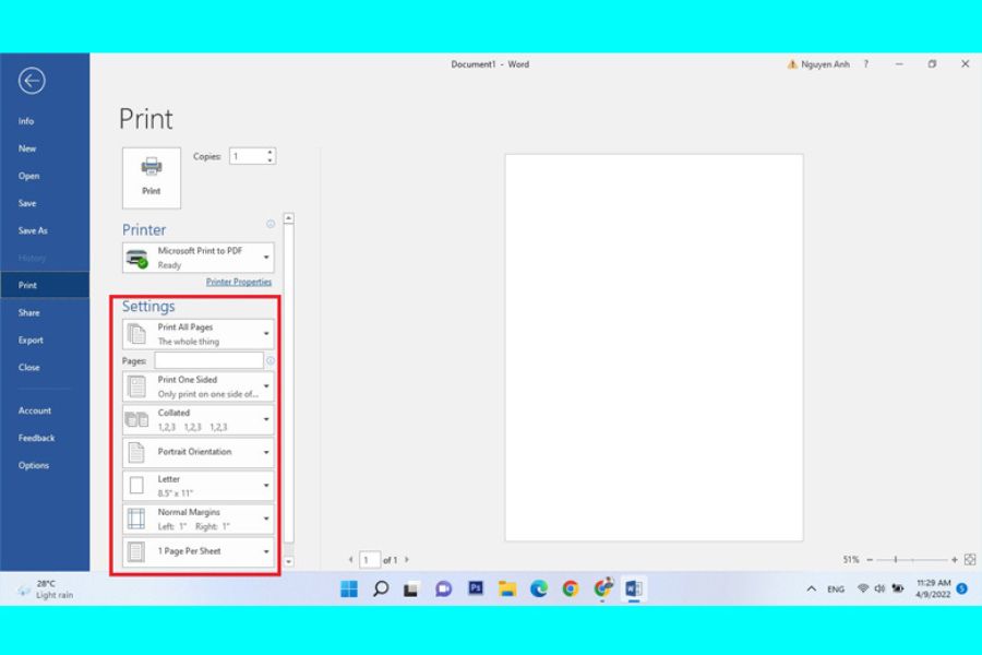 - Bước 3: Tại giao diện mục Print, bạn chọn Settings để cài đặt định dạng bản in theo mong muốn.