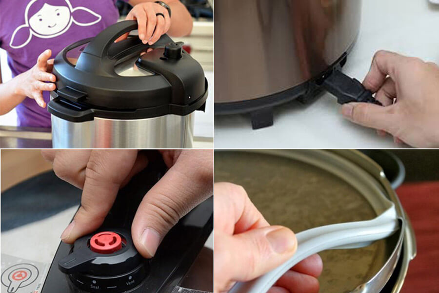 Cách sử dụng nồi áp suất an toàn nhất trong bước này chính là chờ đợi. Bạn đợi đến khi hơi từ van thoát ra hết, khoảng 5 phút. Trước khi mở nắp bạn cũng đừng quên tháo cắm điện của nồi ra nhé, sau đó mới tiến hành mở nắp.