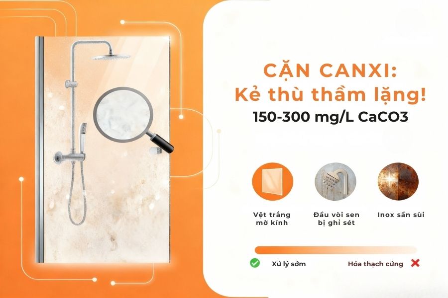 Nước cấp tại các thành phố lớn ở Việt Nam như TP.HCM, Hà Nội thường có độ cứng từ 150-300 mg/L CaCO₃. Khi nước bay hơi sau mỗi lần tắm rửa, khoáng chất không bay hơi theo mà đọng lại trên bề mặt. Lớp này tích tụ dần sau mỗi ngày sử dụng, tạo thành mảng cặn ngày càng dày và cứng.
