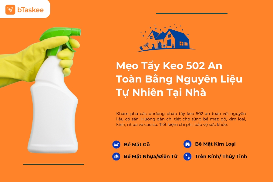 Bài viết này bTaskee sẽ hướng dẫn bạn cách tẩy keo 502 trên nhiều loại bề mặt khác nhau như gỗ, kim loại, kính, nhựa, điện tử và cao su. Mỗi loại chất liệu có phương pháp tẩy keo phù hợp riêng, giúp bảo vệ đồ đạc của bạn mà vẫn đảm bảo hiệu quả.
