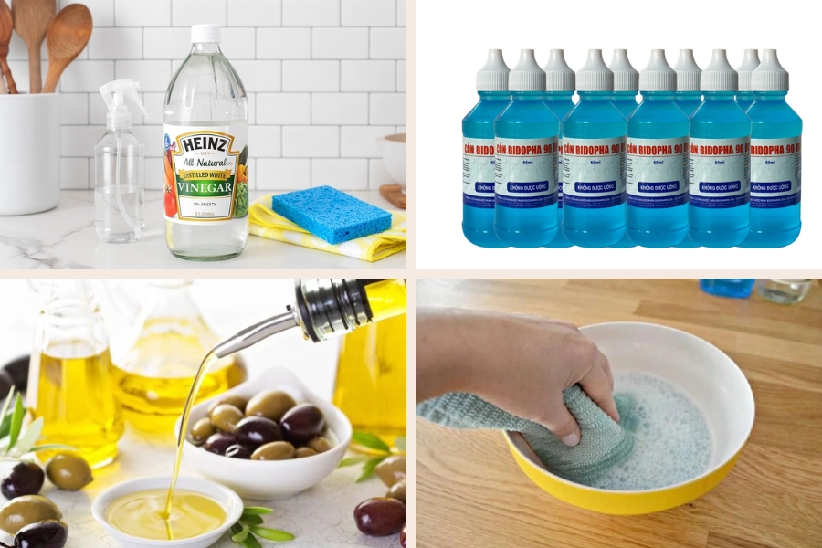 Luôn thử dung dịch (dầu ăn, giấm, chanh, baking soda…) lên một góc nhỏ không lộ diện trước khi dùng lên toàn bộ bề mặt.