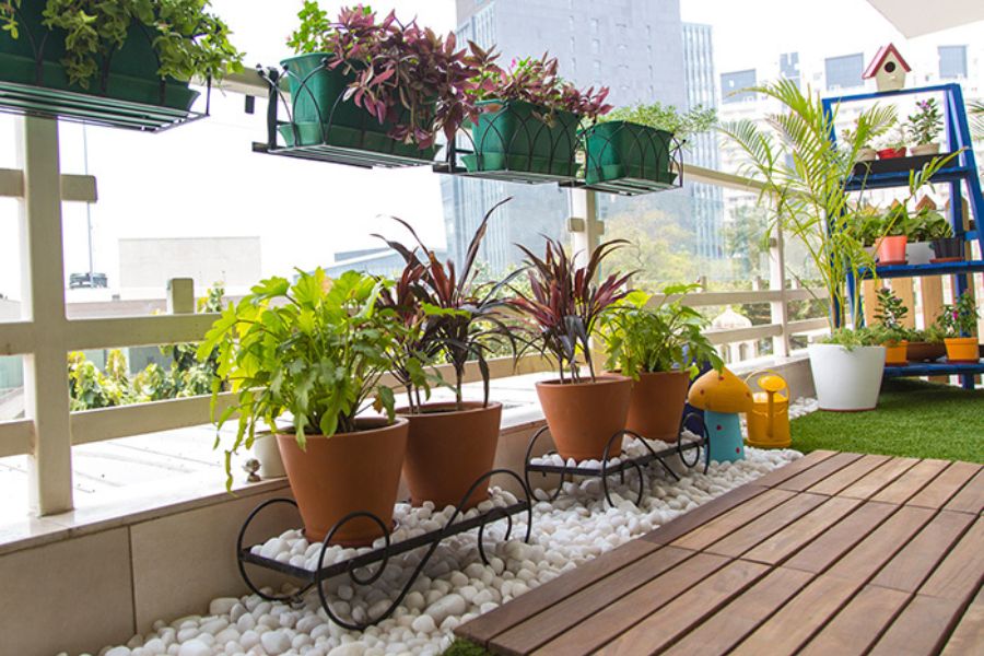 Bạn có thể áp dụng tất cả các cách trang trí trên, điển hình như bố trí dây đèn led, thiết kế kệ trồng hoa tầng, giỏ hoa treo,…