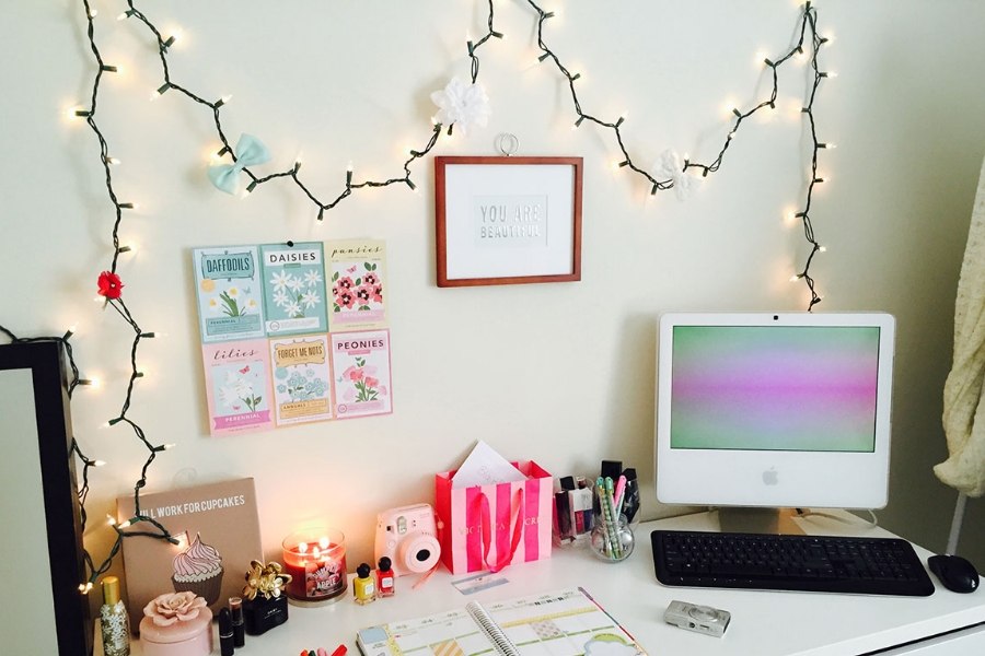 Để bàn học trở nên ấm cúng và rực rỡ hơn, bạn cũng có thể tham khảo ý tưởng gắn đèn led trang trí xung quanh hoặc đơn giản hơn bằng đặt một chiếc đèn trang trí với hình thù yêu thích của mình.