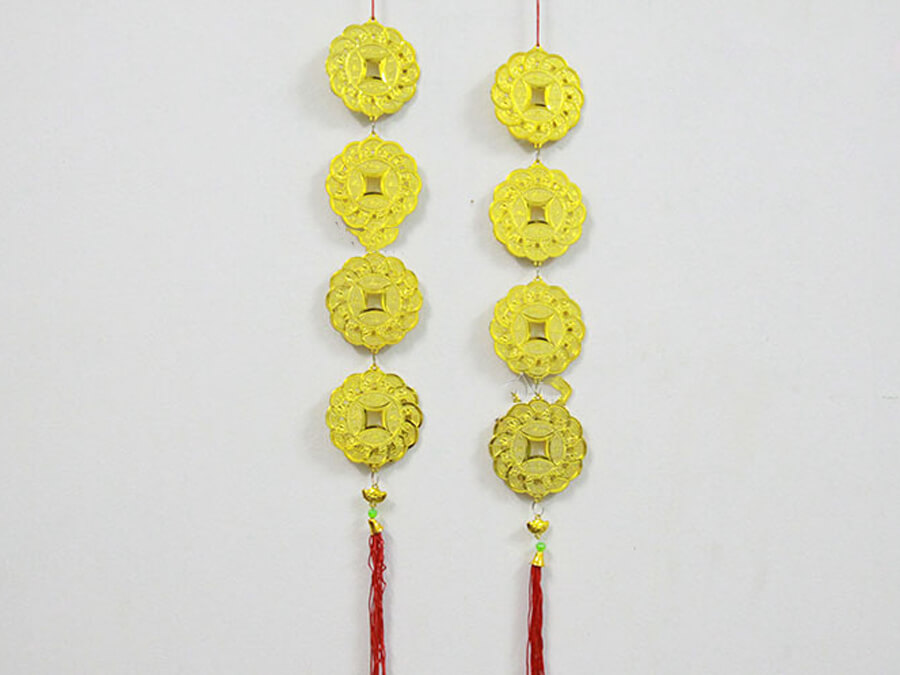 Dây đồng tiền và dây pháo ở đây là pháo giấy và đồng tiền được từ từ nhựa được bày bán ở các chợ. Màu sắc của dây pháo là màu đỏ, các họa tiết trang trí được điểm lên trên có màu vàng. Còn đồng tiền có màu vàng, sợi dây được kết nối chúng lại có màu đỏ.