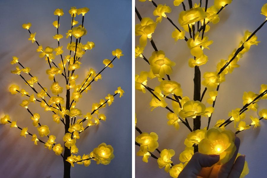 Những ngày Tết chúng ta vẫn thường vui chơi cả vào các buổi tối, vậy nên để cây mai buổi tối lung linh hơn thì việc gắn đèn led lên cây là rất cần thiết. Các loại đèn led nhấp nháy với nhiều màu sắc sẽ khiến cây mai trở nên rực rỡ và xinh xắn hơn.
