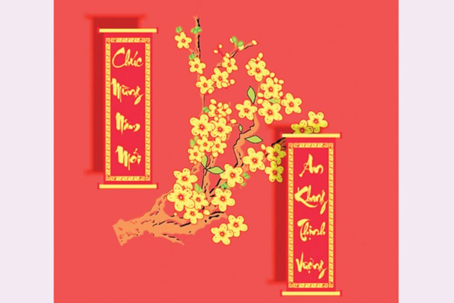 Trang trí cây mai ngày Tết bằng câu đối Tết đỏ không chỉ đem lại vẻ đẹp thẩm mỹ mà còn mang ý nghĩa văn hoá rất lớn. Bạn có thể chọn những câu đối có chứa các lời chúc may mắn như “Phát tài, Phát lộc”, “An khang thịnh vượng”,… để treo trên cành mai cùng mong ước về một năm mới hạnh phúc, bình an.