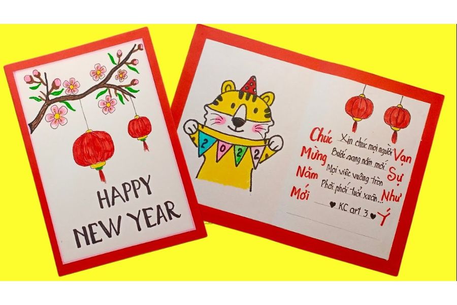 Trang trí cây mai bằng thiệp handmade cũng là ý tưởng rất thú vị, bạn có thể mua thiệp sẵn hoặc cắt thiệp bằng giấy màu và trang trí theo sở thích. Đặc biệt là những lời nhắn nhủ và mong ước được viết bởi chính các thành viên trong gia đình mang một ý nghĩa rất lớn.