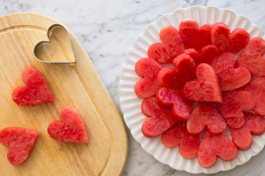 Hoặc một cách khác để tạo hình trái tim cho dưa hấu là tỉa hình chữ V ở giữa quả dưa hấu. Tiếp tục tỉa các cạnh để tạo hình trái tim, cắt miếng vừa ăn. Sau đó trang trí dưa hấu trên đĩa sao cho đẹp mắt.