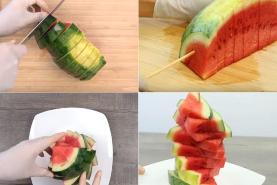 Đây là một trong những cách thái dưa hấu đẹp và dễ trang trí nhất. Hãy bắt tay vào để thực hiện ngay bạn nhé. Quy trình như sau: