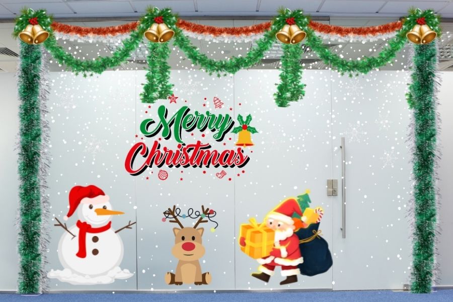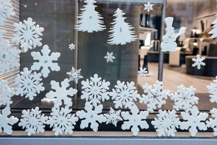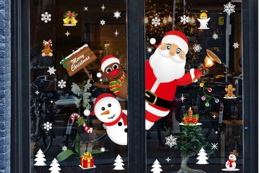 Có nhiều cách để dùng ông già tuyết trang trí Noel cho cửa hàng. Bạn có thể dán lên tượng hay cửa kính tại cửa hàng. Và đừng quên trang trí thêm hình các bông tuyết để “bức tranh” thêm sinh động nhé!